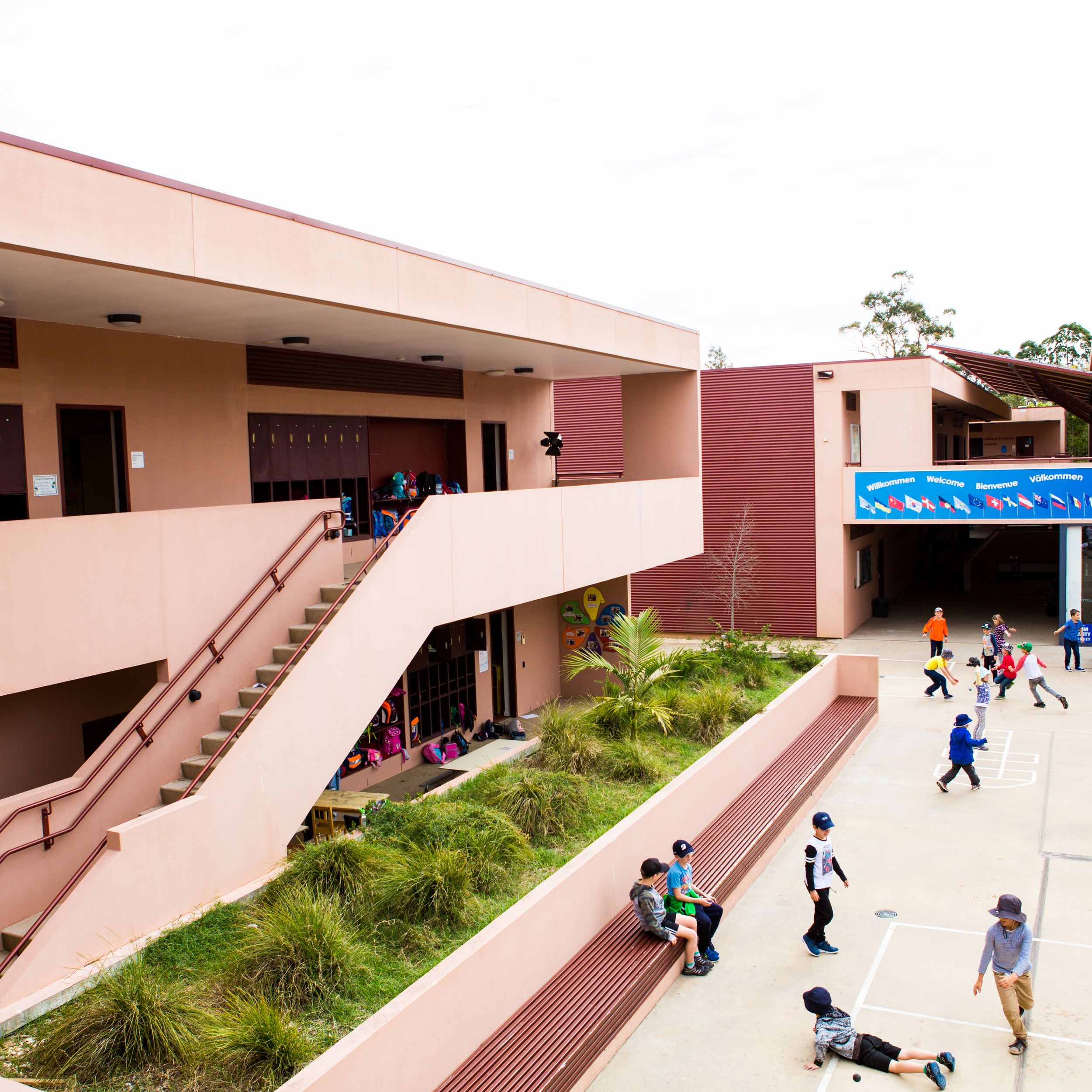 Der Schulcampus besteht aus derzeit 10 Gebäuden, die sich auf mehreren Ebenen dem natürlichen Verlauf des 16,200m2 großen Geländes anpassen.