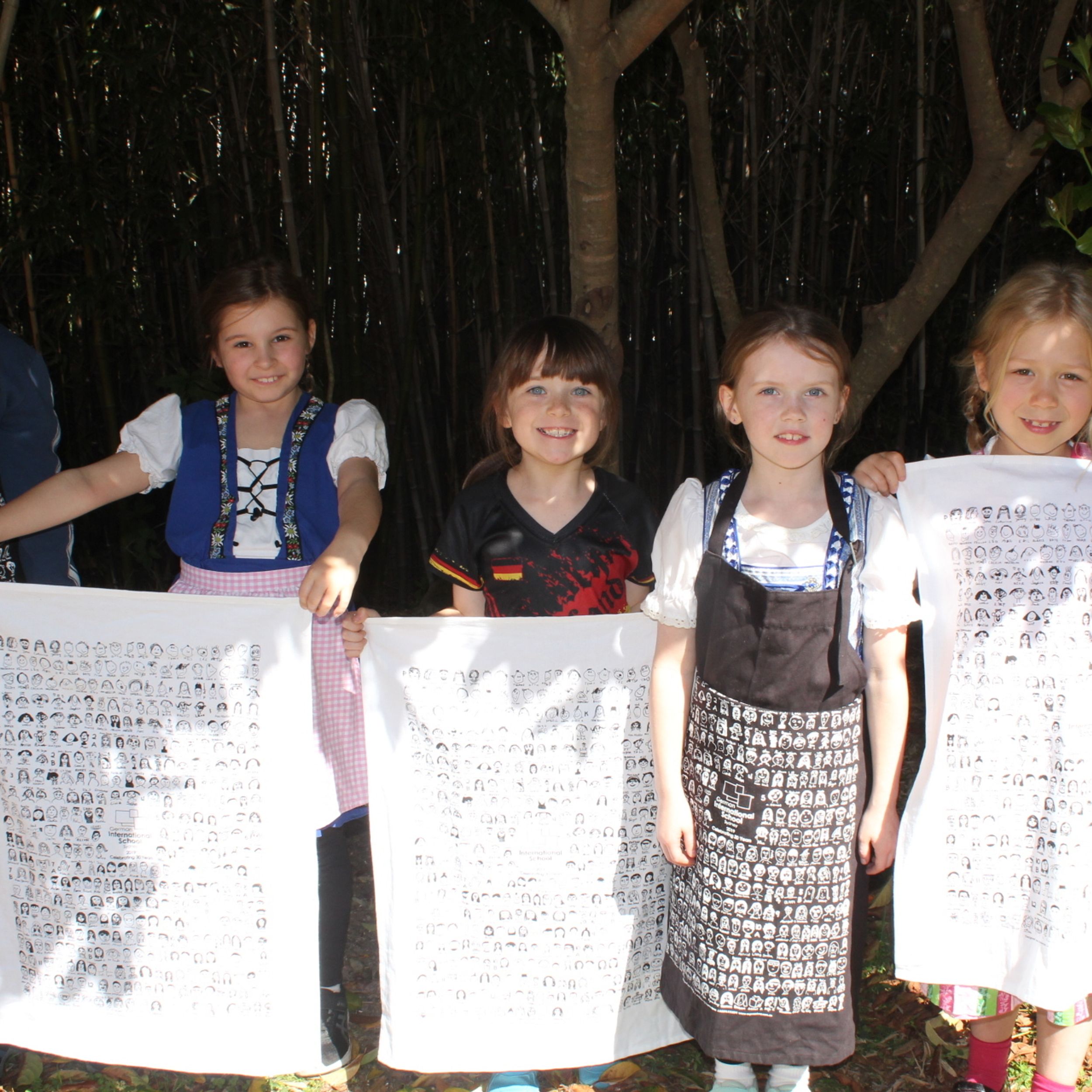 Zu unserem 30-jährigen Jubiläum, haben wir ein Gedenkhandtuch und eine Gedenkschürze mit kleinen Selbstporträts aller Schülerinnen & Schüler und Mitarbeiterinnen & Mitarbeiter entworfen. Beide sind 100% Baumwolle, das Handtuch ist weiß und kostet $15, die Schürze schwarz und kostet $20.