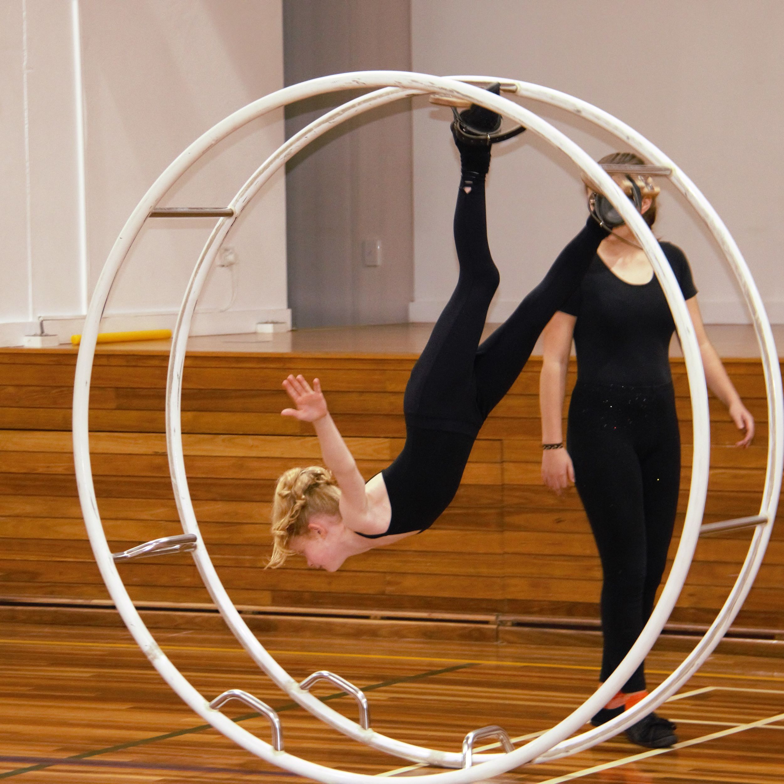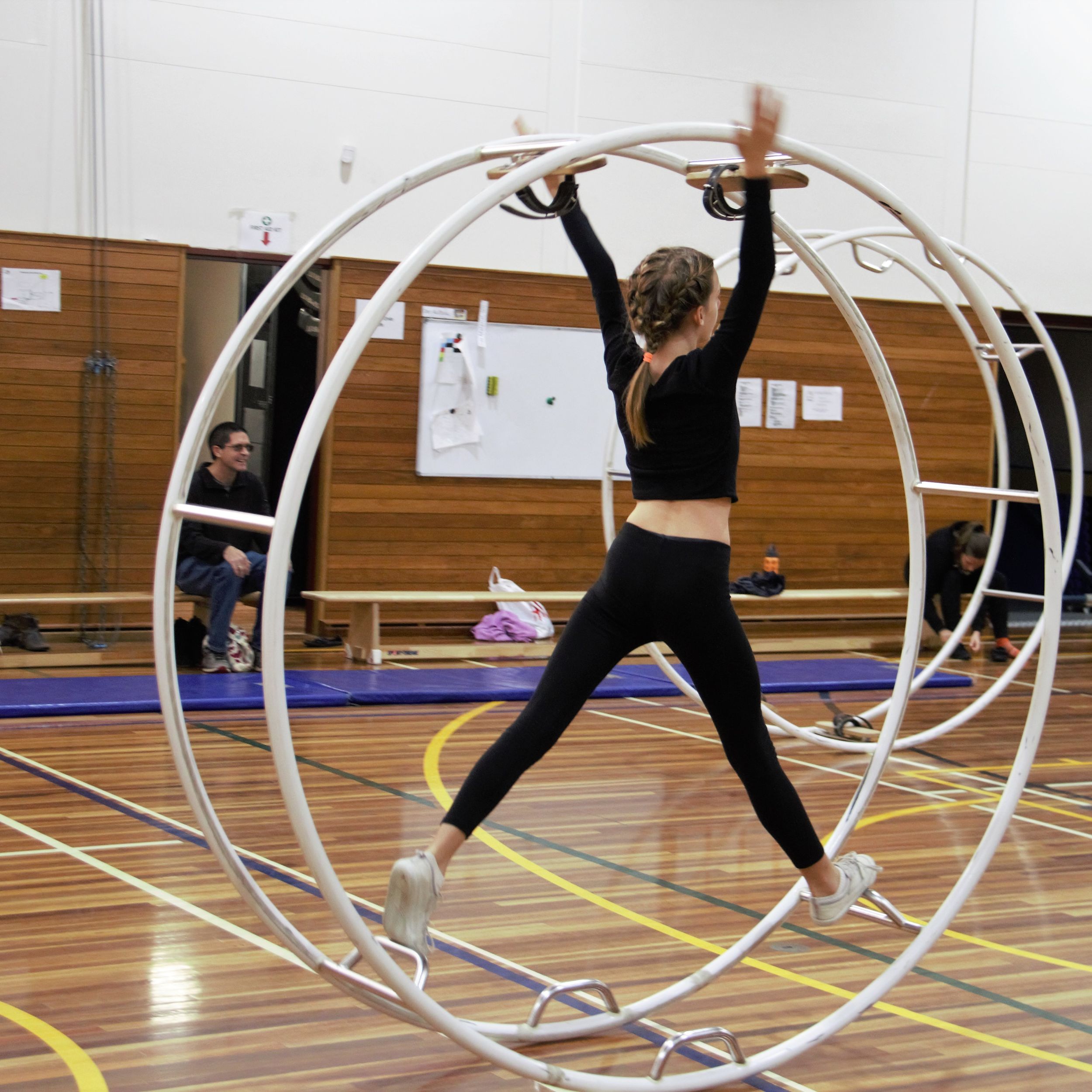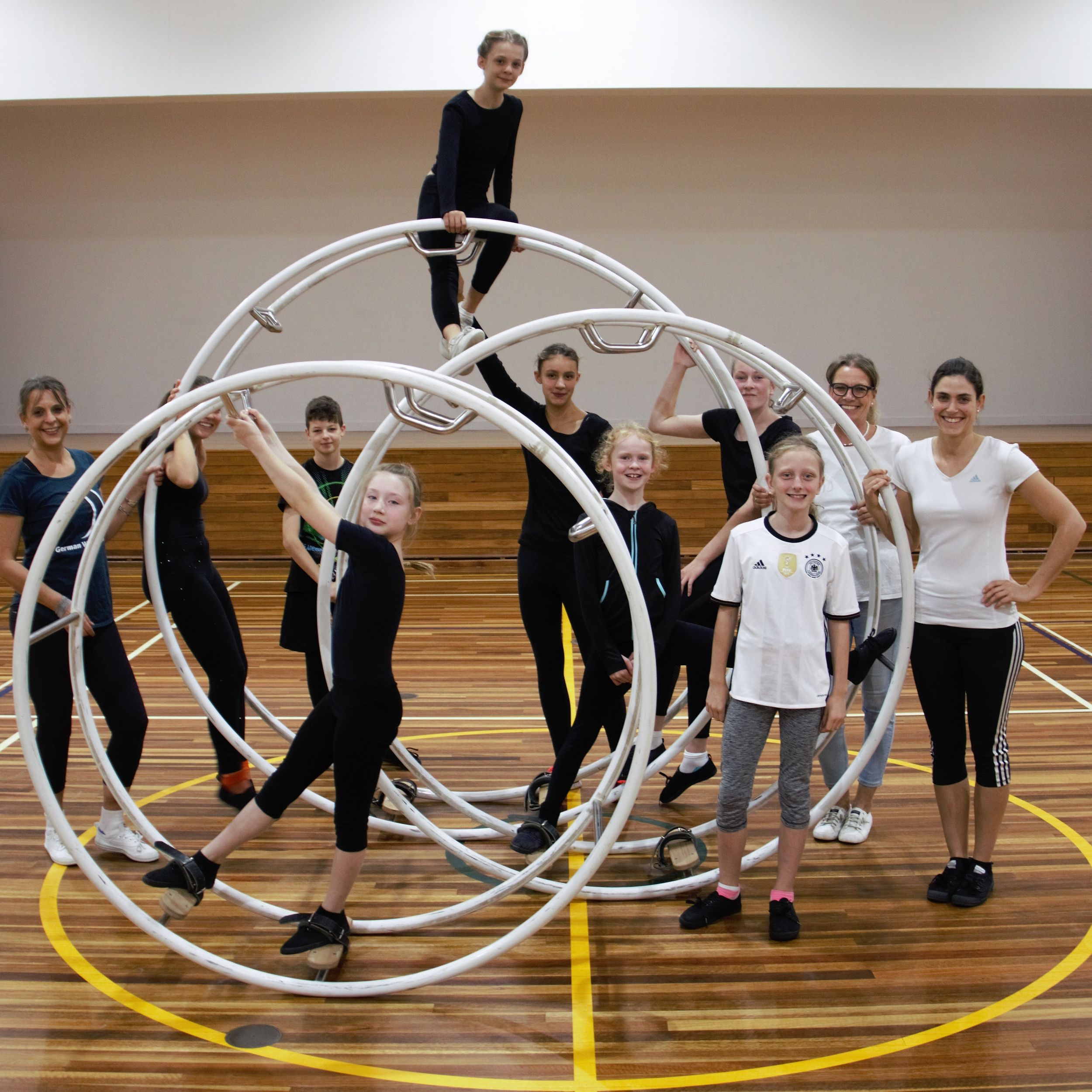 On 19th May 2019, the German International School Sydney hosted the second German Wheel competition since its formation. The 9 competitors, aged between 9 and 28 years, started in 3 different start groups, depending on their age and level. The three youngest and newest competitors, Carla, Emmelie and Juliana were showing their beginner’s routines (Level 5 routine), with Juliana making first place. It was their first ever competition, having practised German Wheel for approximately one year. Remarkably, all of the girls were able to complete their routines without assistance from a trainer despite nervousness and limited amount of experience.
