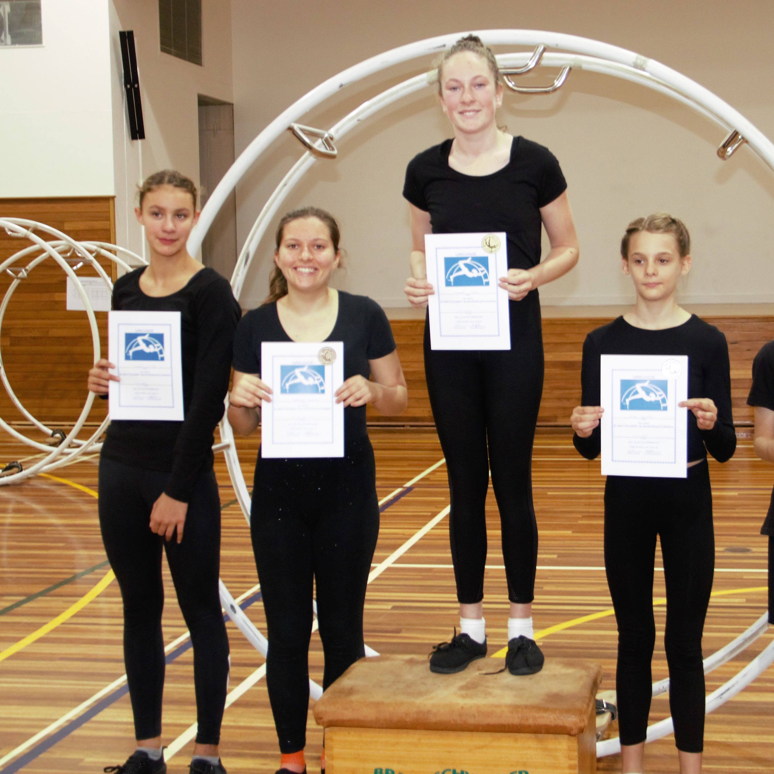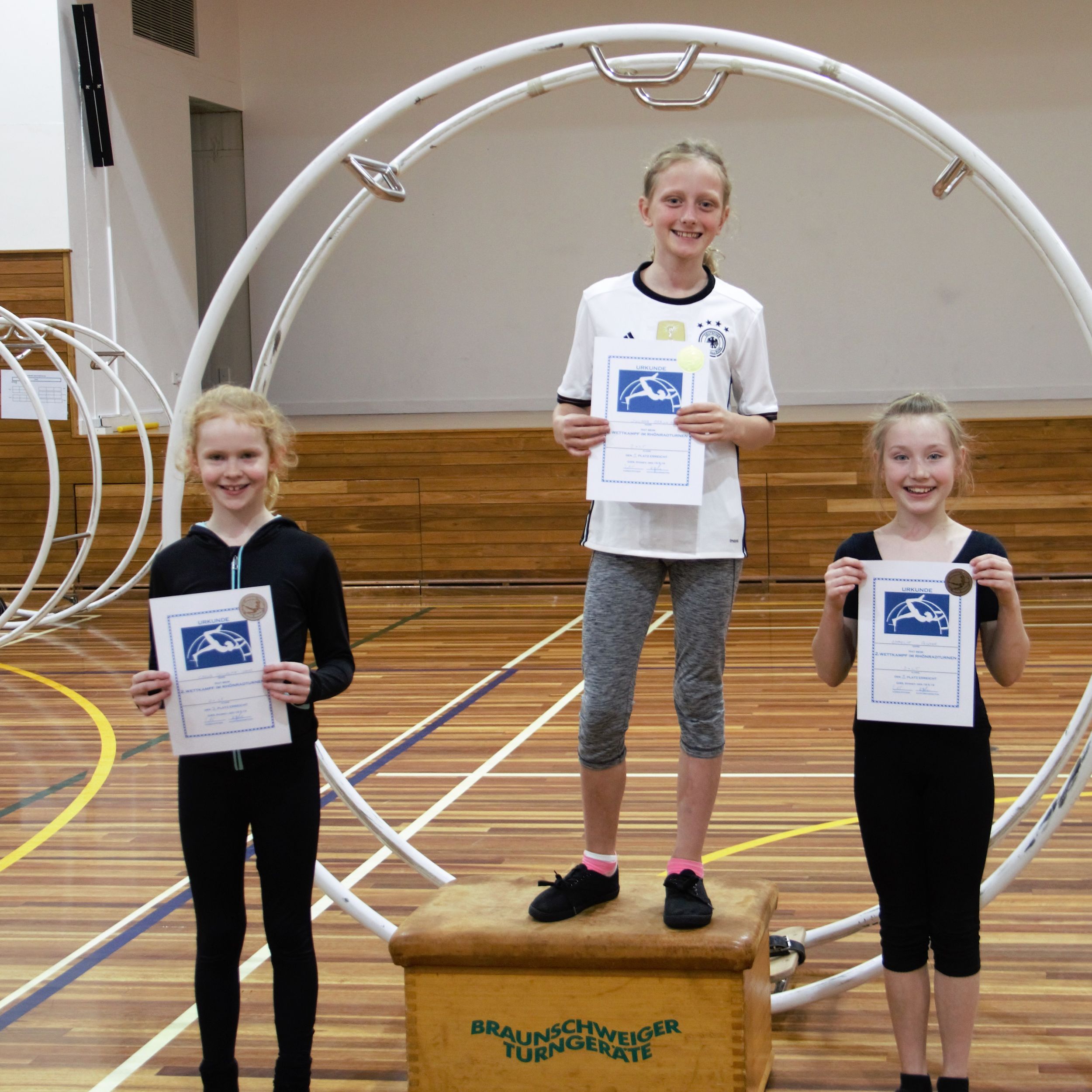 In the second start group competed the more experienced and older gymnasts (born between 2003 and 2006). Saskia, Nina, Lanea, Sienna and Cornelius showed their individual, creative routines, as well as a given combination of exercises (Level 5 routine or Level 6 routine). Within that start group, Sienna was the only participant showing a Level 6 routine, which is more difficult and therefore scores higher points. The students of this group have participated in German Wheel gymnastics for several years and have shown great improvements since the last competition. They have learnt new and more difficult exercises, which score higher points but also increase the risk of point deductions for not straightening arms and legs or for needing trainer assistance during the presentation. Having scored most points in both her performances, Sienna won today’s competition before Nina and Saskia on second and third place.
